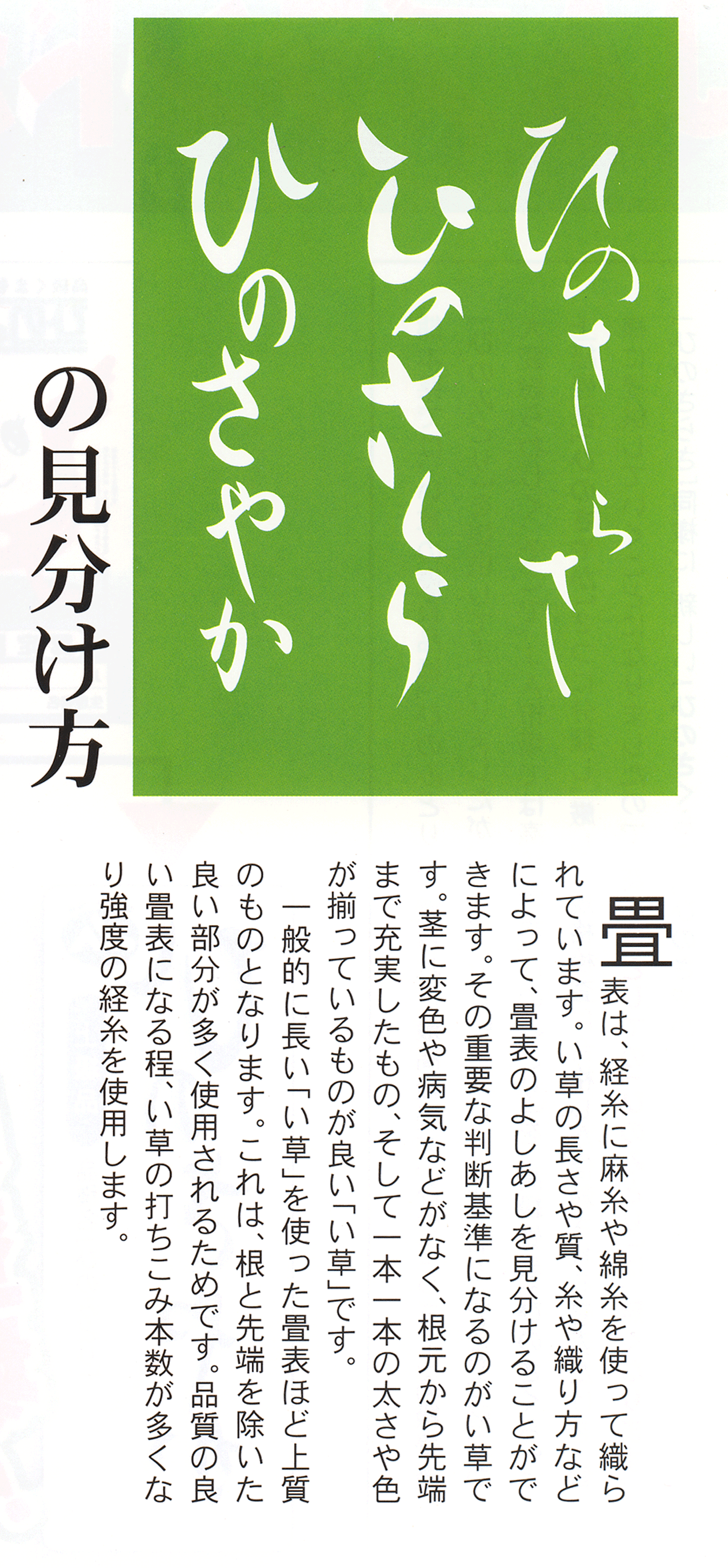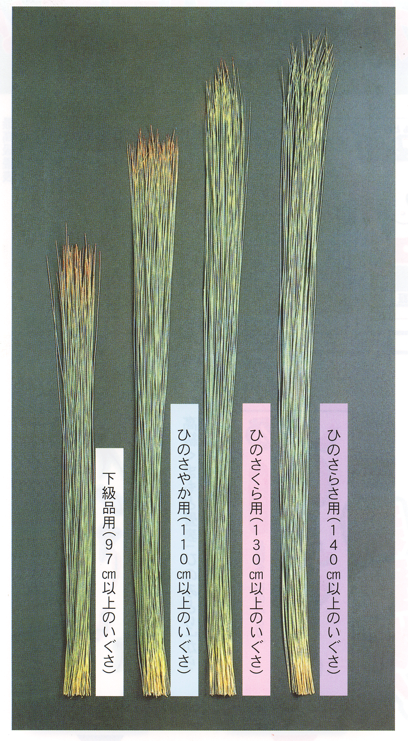 国産畳表のシェアNO.1を誇る熊本産八代表。その種類とグレードは数限りなく、その中でも熊本の農協で規格するブランドがこの「ひのさらさ」、「ひのさくら」、「ひのさやか」です。これらのい草はすべて数年前に品種改良されて開発された「ひのみどり」と言う品種から出来ていて、商品名の違いは草の長さにあると言えます。これらの規格以外にも在来種を使って織った畳表が無数に存在するのです。分かりやすく言うと、お酒の一級酒、二級酒と言ったところでしょうか?